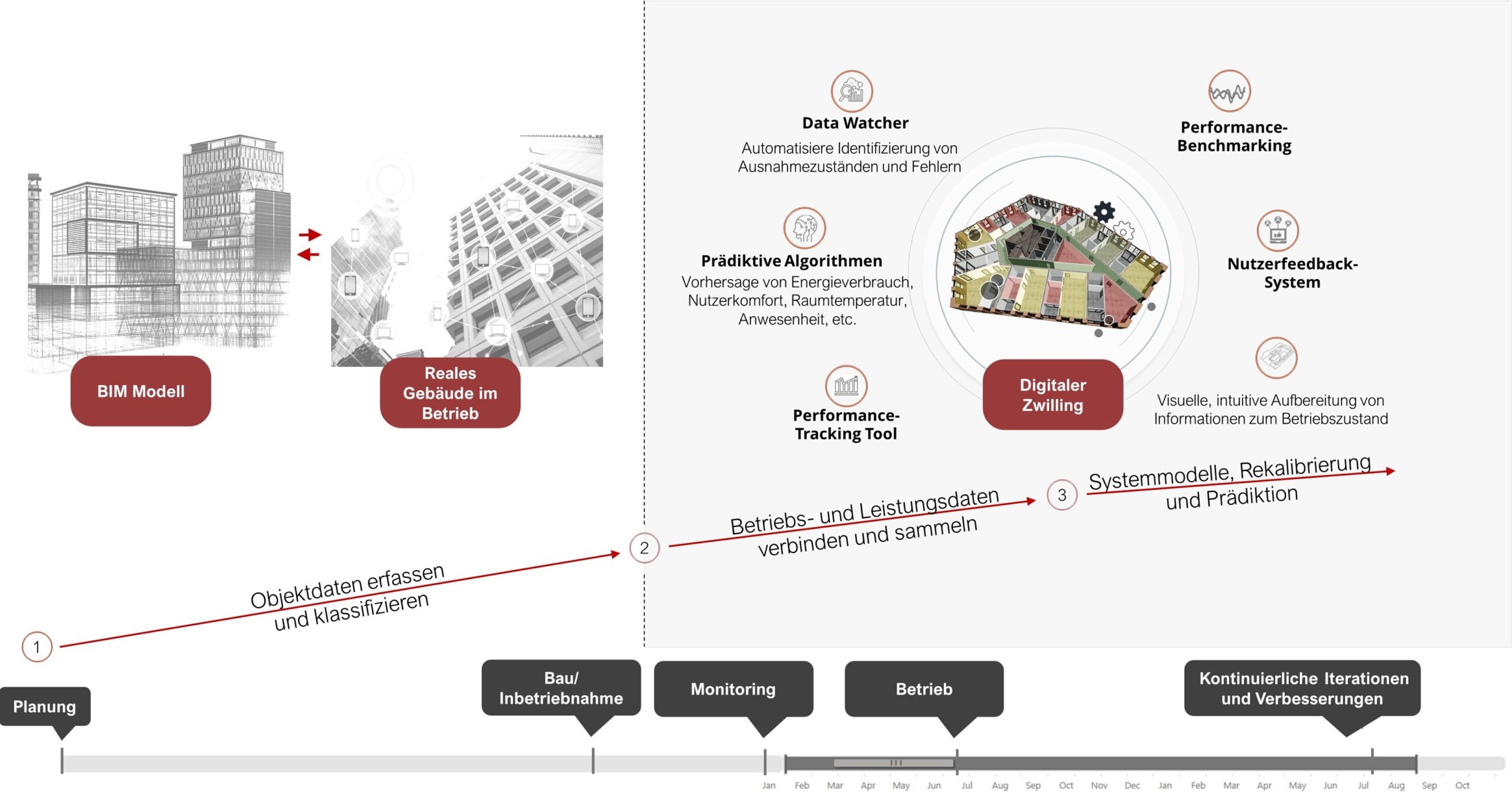 Von der Bauphase über den Betrieb bis hin zur Instandhaltung bietet der digitale Zwilling eine durchgängige Datenbasis, die den gesamten Lebenszyklus eines Gebäudes begleitet und optimiert.